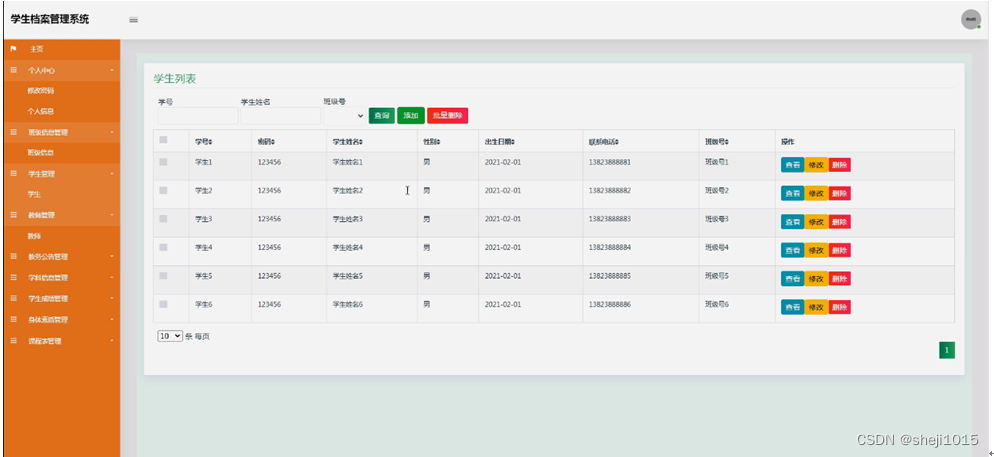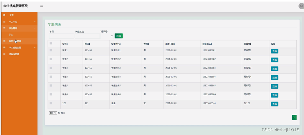 学生管理,在学生列表中可以查看学号、密码、学生姓名、性别、出生日期、联系电话、班级号等信息,并可根据需要进行修改或删除等操作,如图5-4所示。