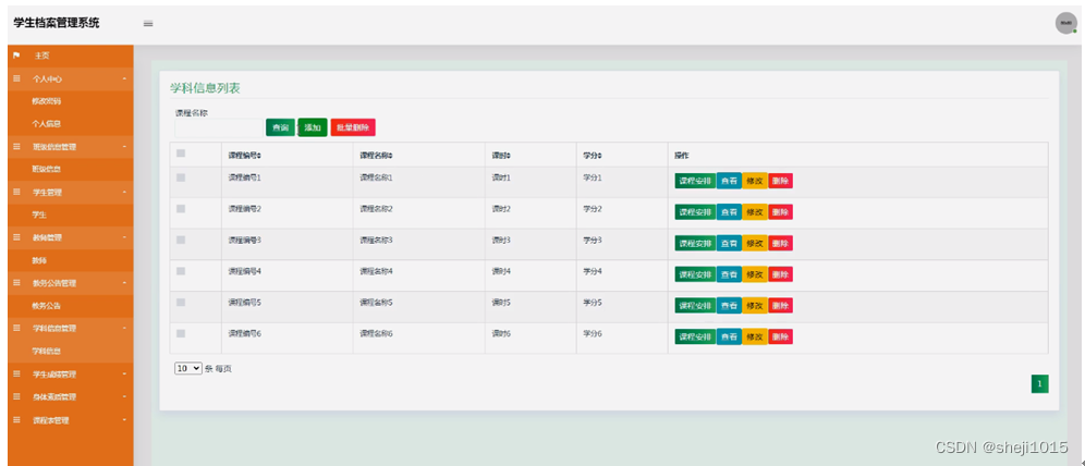 学科信息管理,在学科信息列表中可以查看课程编号、课程名称、课时、学分等信息,并可根据需要进行课程安排、查看、修改或删除等操作,如图5-7所示。
