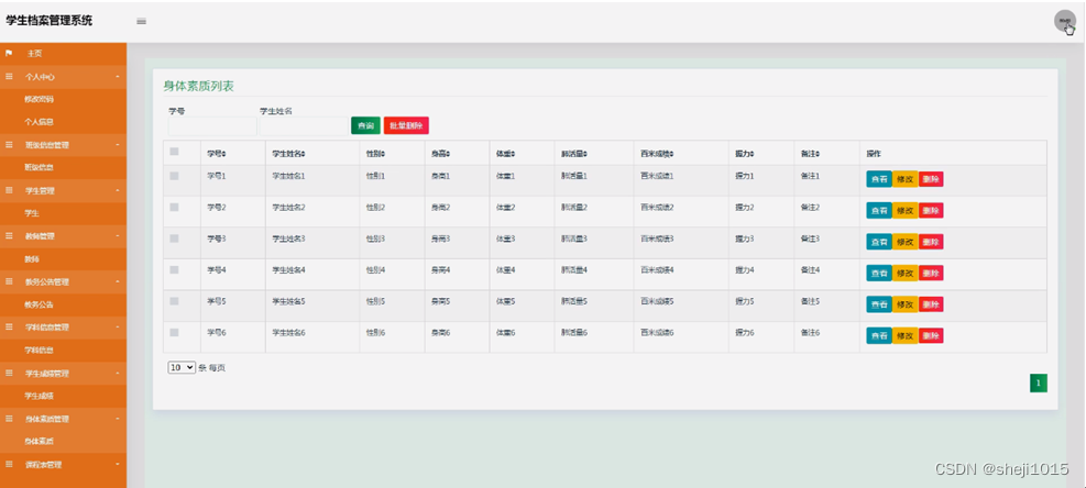 身体素质管理,在身体素质列表中可以查看学号、学生姓名、性别、身高、体重、肺活量、百米成绩、握力、备注等信息,并可根据需要进行修改或删除等操作,如图5-9所示。