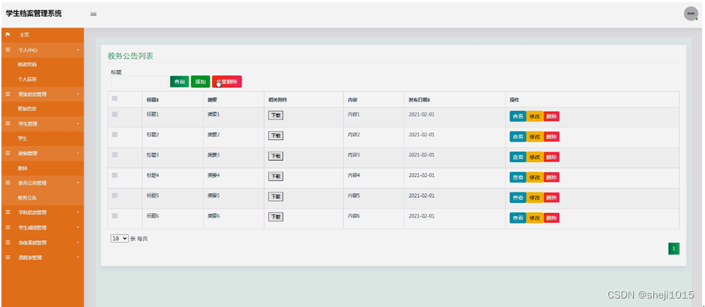 教务公告管理,在教务公告列表中可以查看标题、摘要、相关附件、内容、发布日期等信息,并可根据需要进行修改或删除等操作,如图5-6所示。