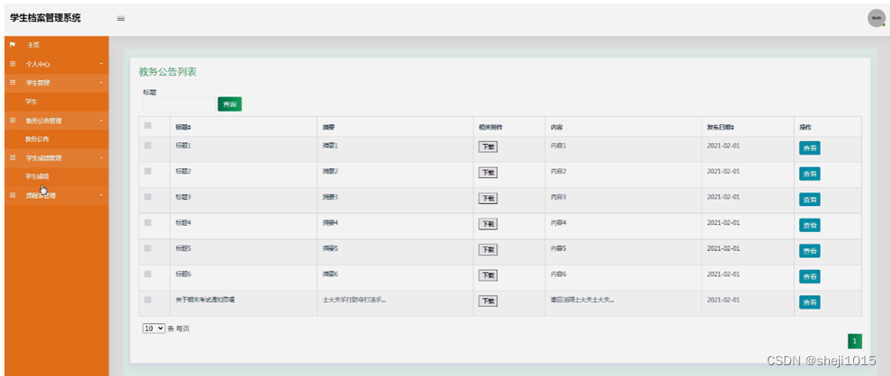 教务公告管理,在教务公告列表中可以查看标题、摘要、相关附件、内容、发布日期等信息内容,如图5-13所示。