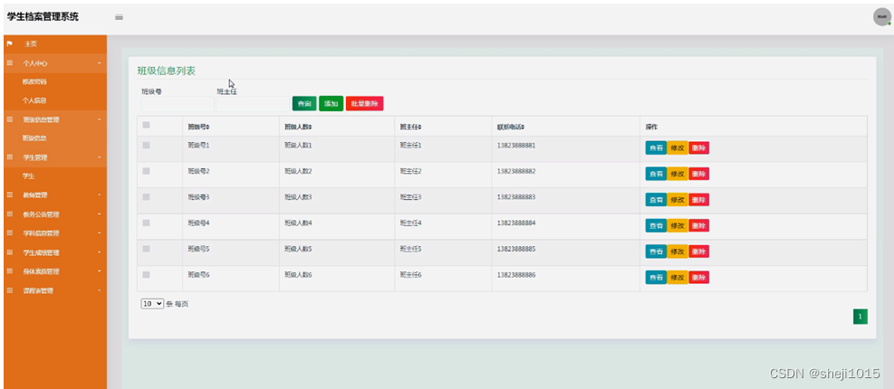 班级信息管理,在班级信息列表中可以查看班级号、班级人数、班主任、联系电话等信息,并可根据需要进行修改或删除等操作,如图5-3所示。