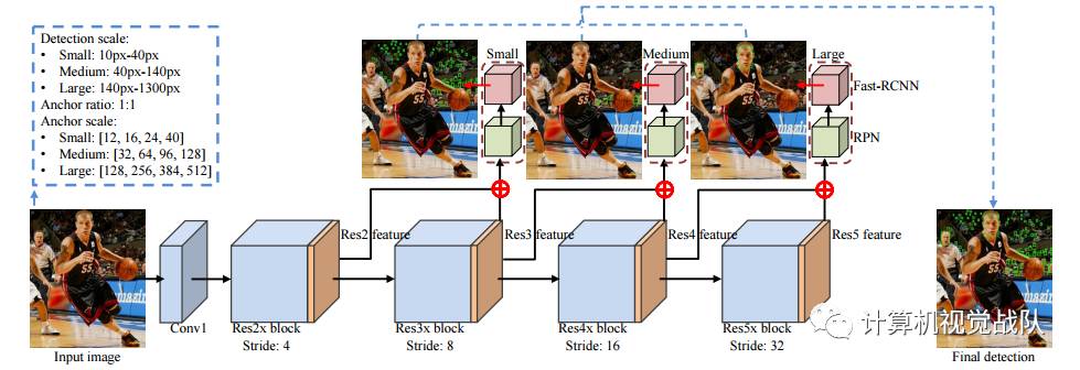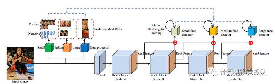 采用ResNet网络,输入单张图片。 在网络不同阶段引出分支,然后后接RPN和Fast R-CNN。 共有3个分支,每个分支只负责检测对应范围的人脸。