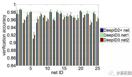 在训练样本上,DeepID3仍采用原来DeepID2+中使用的样本,在25个image patches产生的网络上作对比时,DeepID3 net1优势最为明显,而DeepID3 net2提升不大显著。