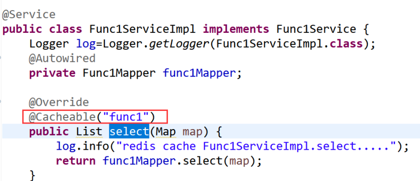 public class Func1ServiceImpl implements Func1Service {Logger log=Logger.getLogger(Func1ServiceImpl.class);@Autowiredprivate Func1Mapper func1Mapper;@Override@Cacheable("func1")public List select(Map map) {log.info("redis cache Func1ServiceImpl.select....."); return func1Mapper.select(map);}}
