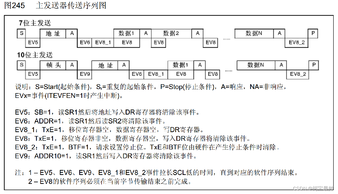 整个时序过程看着操作比较多,但是简单来说就是:写入控制寄存器CR或者数据寄存器DR,就可控制时序单元的发生。查看EVx事件需要查看状态寄存器SR。用库函数操作很简单!!