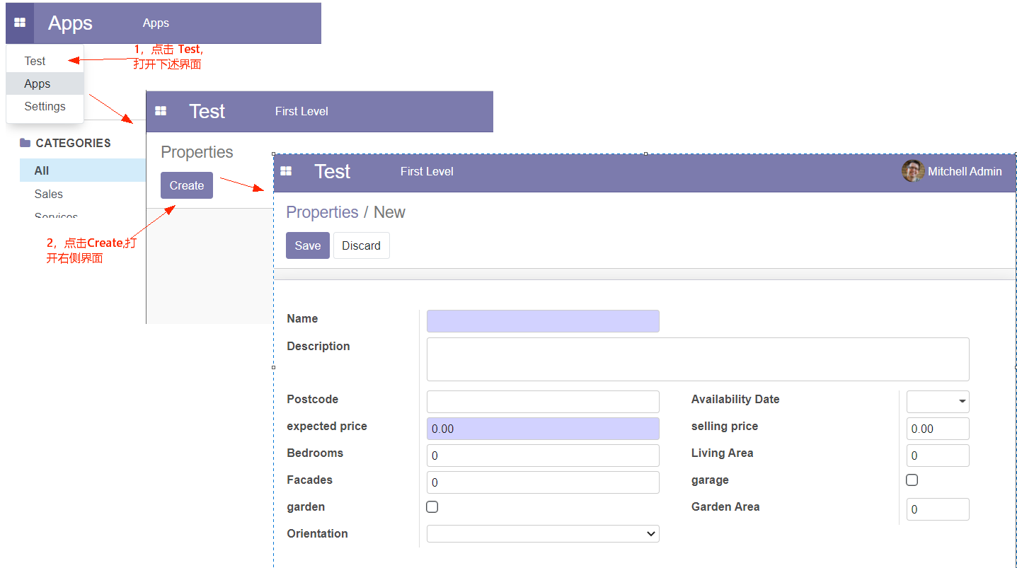 本章仅涵盖第一种情况。 我们Real Estate例子中,希望将一个菜单连接到 estate.property model, 以便创建一个新记录。 action可以视为菜单和model之间的链接