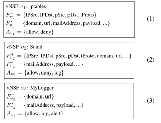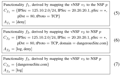 每个vNSF的清单映射到每个NSP,此操作的结果是安全功能。可能会发生这样的情况:给定更多的vNSF清单,它们为给定NSP生成的功能是相同的。在这种情况下,将保留该功能的单个实例。类似地,vNSF可能不支持NSP条件中指定的字段中的任何字段。将其清单映射到NSP不会产生任何功能,因此,vNSF在强制实施时被预先排除在外。