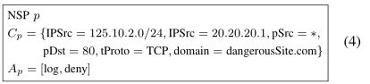 在此公式中,每当字段不必以特定值为特征时∗ 值用于该字段上的条件。例如,pSrc=∗ 意味着对传输级源端口必须具有的值没有严格的条件,用于标识必须强制执行安全操作的流量。