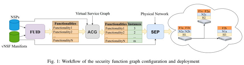 FUID阶段在安全提供程序指定的一组NSP上工作。在接收到MLPL中表示的一组NSP后,FUID阶段将确定实施这些NSP可能需要的功能。要执行此任务,它可以访问一个存储库,该存储库包含可用于在网络中进行有效部署的所有VNSF。每个vNSF均附有符合第二节定义的清单。