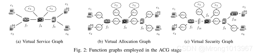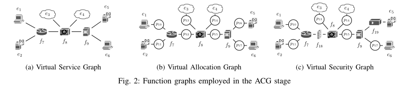 MaxSMT问题的解决方案是虚拟安全图(VSerG),其中一些AP使用选定的功能填充,这些功能的配置方式也可以强制用户指定的NSP。图2c中描绘了VSecG的示例,其中F18和F19是V AllG中引入的安全功能。此图表示比传统虚拟图更高的抽象,其中通常存在VNSF。