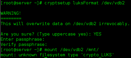 cryptsetup luksFormat /dev/vdb2 对磁盘进行加密
