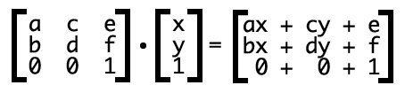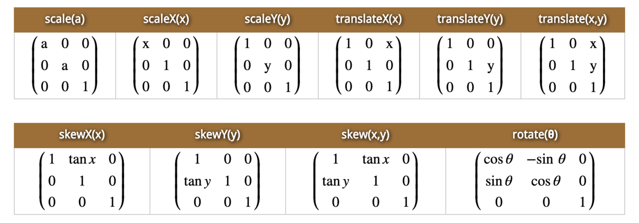 matrix是最基本的变化,它有六个参数,这六个参数给定特殊的值,就可以实现translate/rotate等特殊的效果: