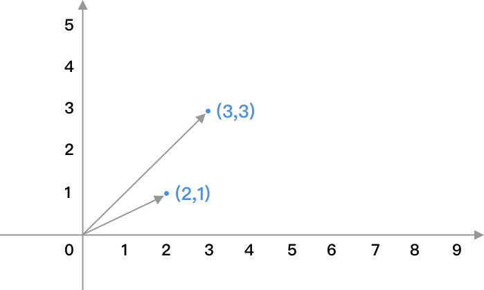 向量用来描述方向和大小,一般使用笛卡尔坐标系来进行向量的描述,比如向量(2, 1)和(3, 3)在坐标系中表示如下:
