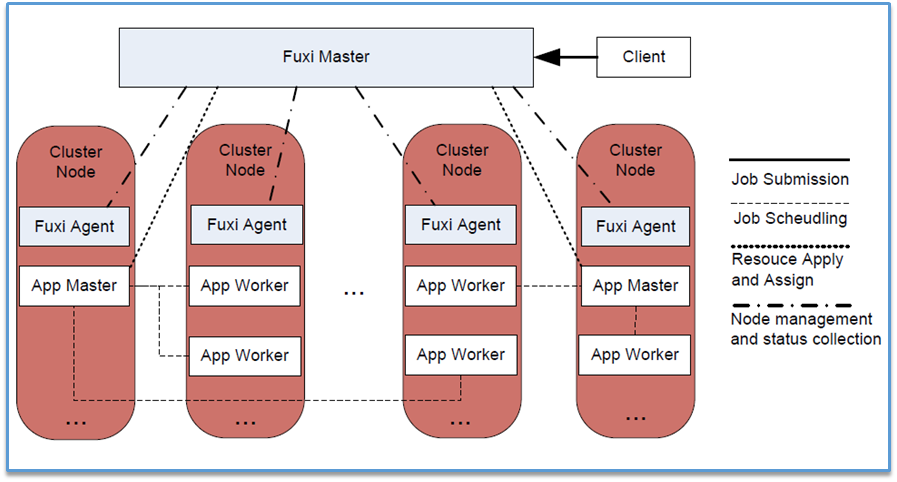 伏羲采用通用的主从架构,它有三个组件:中央资源管理器(称为FuxiMaster),分布式节点管理器(称为FuxiAgent,也叫Tubo)和应用程序主机(Application Master)。
