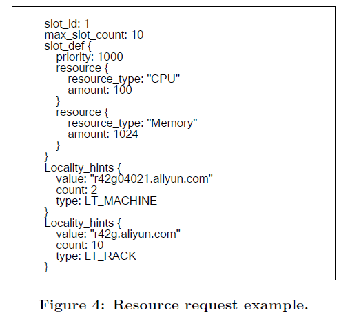 在运行不同类型计算任务的大型集群上,进程实际上需要在不同维度上有不成比例资源需求,例如, CPU,内存。 Fuxi将所有这些不同的需求整合到一个统一的多维资源描述中,其中包括目前物理资源的CPU和内存,但未来可以很容易地扩展到更多维度。 它可用于描述单个节点的总资源和可用资源以及资源请求的数量。 所有资源分配都基于此资源描述抽象,同时必须满足此描述的所有维度。