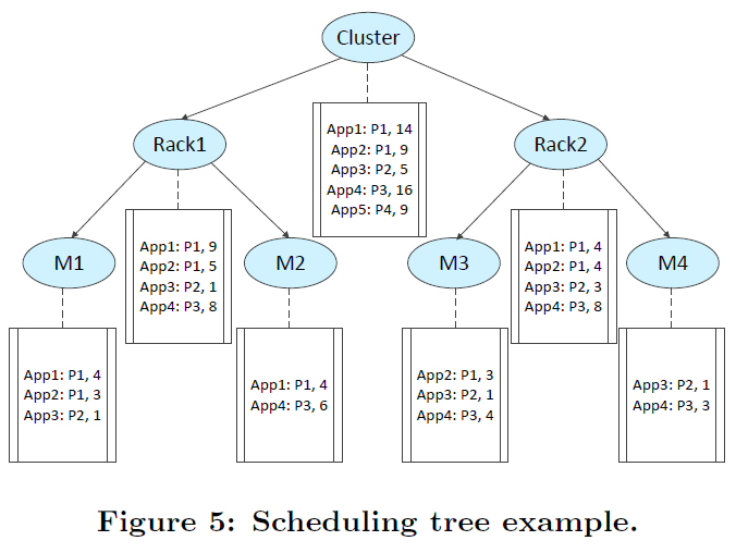 特别地,这种基于位置树的调度是Fuxi和Yarn之间的另一个主要区别。 Fuxi 在 FuxiMaster 调度器中将这些不满足的资源请求排队,并在资源释放时自动将资源授予 Application Master。通过这种方式,我们可以在提高集群利用率的同时加速资源释放和重新调度。当一个 Application Master 返回一台机器的资源时,将选择某个等待的应用程序来获取已释放的资源。优先级是主要考虑因素,具有更高优先级的应用程序将首先获得资源。当优先级相同时,将考虑等待时间。此外,等待在计算机队列上的应用程序将优先于等待在计算机所属的机架/群集队列上的应用程序。目标是在优先级相同的情况下确保集群整体局部性计算。应用程序可以选择在特定计算机,某个机架或群集中的任何计算机上等待,并且在同一树上等待的所有应用程序都按优先级和提交时间排序。下图可以被示为调度树的示例。 App1 等待 M1 上4个单位的资源和 M2 上4个单位的资源,而 Rack1,Rack2 和整个集群上分别有9个单元、4个单元和14个单元。当满足任何这些等待请求时,资源将被分配给 App1,相关的等待请求将减少分配的单位数量。