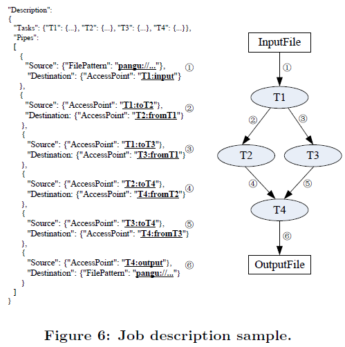 Fuxi Job使用DAG(有向无环图)来呈现一般用户工作流程,类似于 Tez 和 Dryad 等其他系统。 配置Fuxi DAG工作非常简单。 该框架接受JSON文件作为工作描述。 我们以下图为例来解释工作描述。 JSON文件有一个字段“任务”,它描述了每个任务的属性,包括可执行二进制路径和其它用户自定义参数。 字段“管道”描绘了所有数据,每个数据具有与任务相关联的“源”和“目的地”接入点。 圆形数字澄清了右侧JSON le和DAG gure之间的对应关系。 用户使用Fuxi Job SDK和编程API嵌入他们的任务逻辑。 对于 data shuffle,我们将公共数据运算符(如sort,merge-sort,reduce)封装到一个名为 Streamline 的库以及已发布的SDK中。 该库可以方便Fuxi的使用来定制作业的用户逻辑。