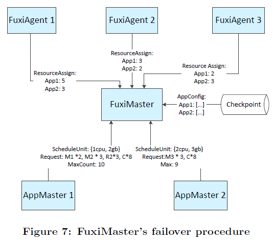 FuxiAgent 故障转移:FuxiAgent 也支持透明故障转移。在故障转移期间,FuxiAgent首先收集先前启动的运行进程信息,然后从每个相应的 Application Master 请求完整的 worker 列表。在 FuxiMaster 为每个应用程序提供的完全授权资源量之后,FuxiAgent 将在故障转移之前重建完整状态。