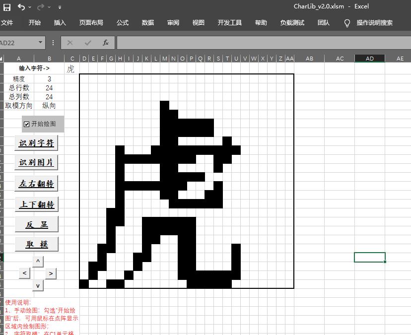 3、字符输入:可在C1单元格中输入任意可视字符(每次一个字符),字体、字号、粗体、斜体、下划线可通过excel进行设置,然后点击”识别字符“,即可自动生成字符的点阵,较小字号的字符可通过调整“精度”或手动绘图,提高点阵质量(字号较小的字符,建议采用“宋体”、“等线”字体);