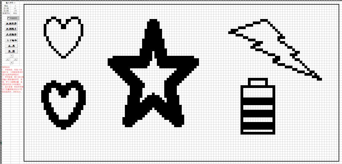 2、手动绘图:设置好显示区域的行像素和列像素,勾选“开始绘图”复选框后,可以通过鼠标左键在设定的显示区域内点击或拖动进行图形手动绘制点阵;