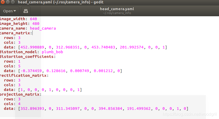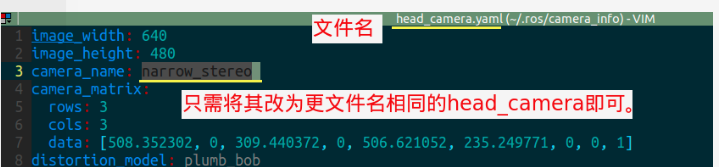 最后只需要打开head_camera.yaml文件修改一下就能保证该校准参数文件正常使用了: