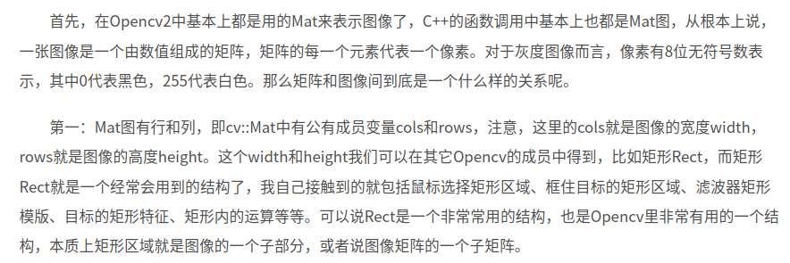 cv::Mat 是类,它利用了类的特性,将内存管理和数据信息封装在类的内部,用户只需要对Mat类对象进行数据或面向对象操作即可。Mat本质上是由两个数据部分组成的类: (包含信息有矩阵的大小,用于存储的方法,矩阵存储的地址等) 的矩阵头和一个指针,指向包含了像素值的矩阵(可根据选择用于存储的方法采用任何维度存储数据)