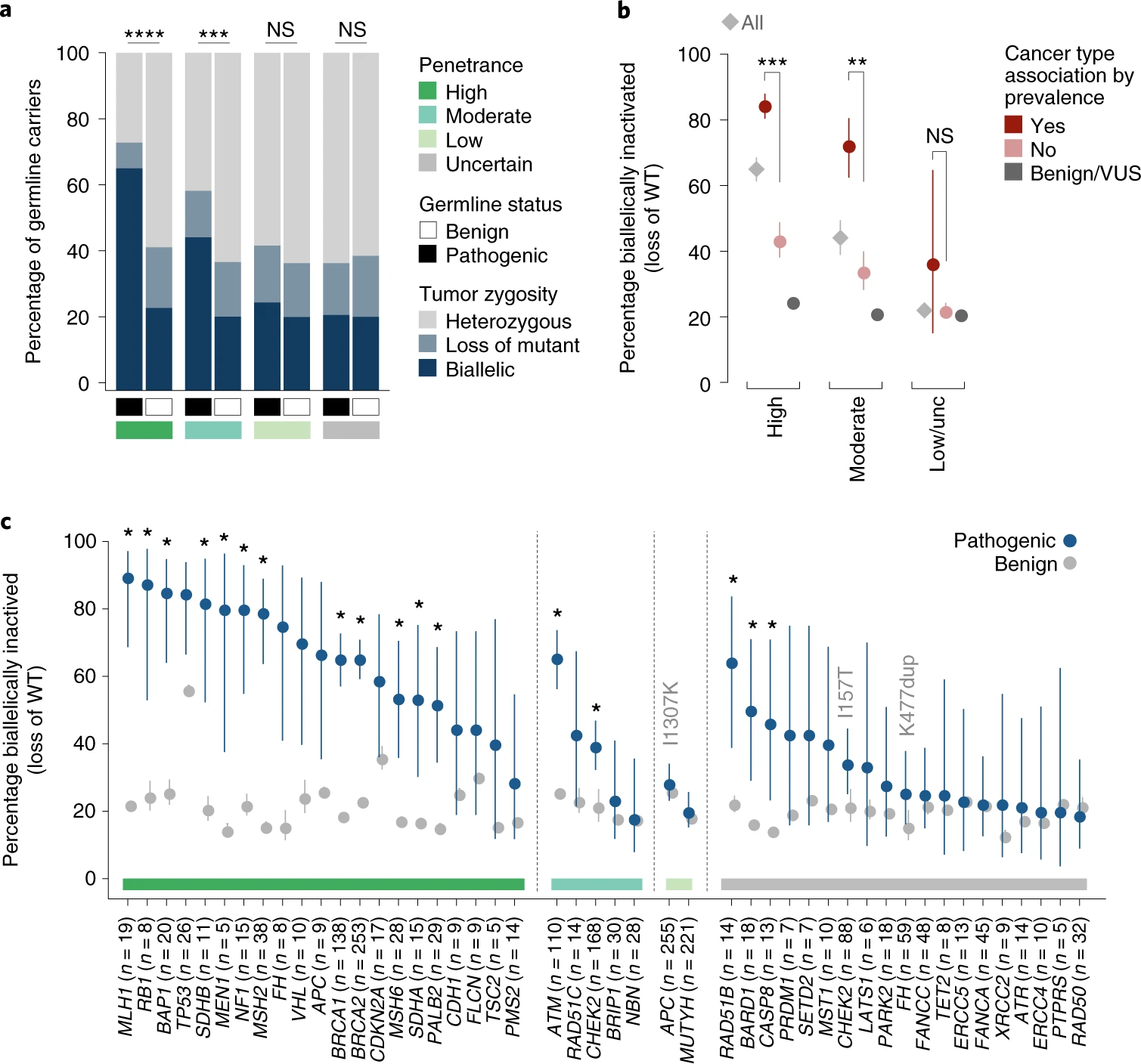 - 野生型等位基因 (WT) 缺失是肿瘤发生的关键因素,作者用体细胞拷贝数杂合性丢失 (LOH)或第二体细胞突变评估肿瘤特异性体细胞双等位基因失活率,作为衡量肿瘤形成和进展的指标。总共挑选了 176 个抑癌基因中的 57 个基因(超过5位患者均有该基因的致病性突变)进行评估,体细胞致病性突变双等位基因失活率为 40%,显着高于良性变异的双等位基因失活率(22.1%;P = 5.7 × 10-76);