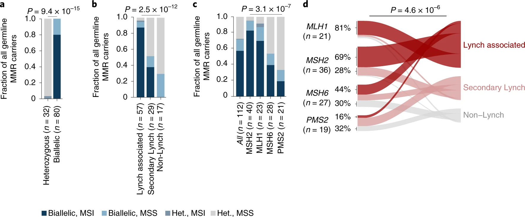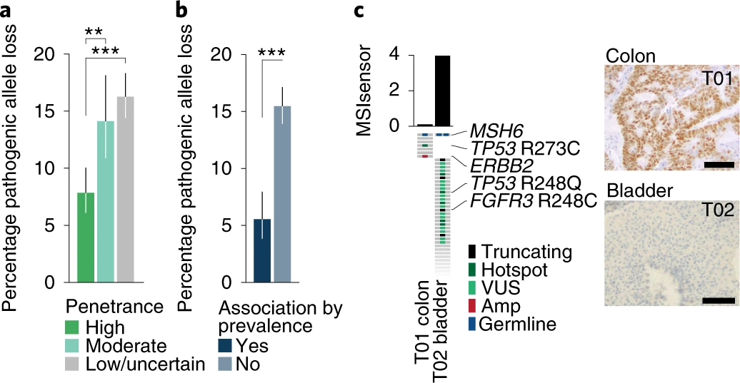 - 为了进一步探索体细胞双等位基因失活对生殖系疾病的驱动作用,作者以林奇综合征 (LS) 作为研究对象。LS 患者的种系错配修复(MMR)基因容易发生微卫星不稳定 (MSI),MSI 是一种与肿瘤无关的生物标志物。结果观察到在发生体细胞双等位基因失活的MMR携带者中,发生MSI的比例大大提升,说明体细胞双等位基因失活可影响 MSI 表型;