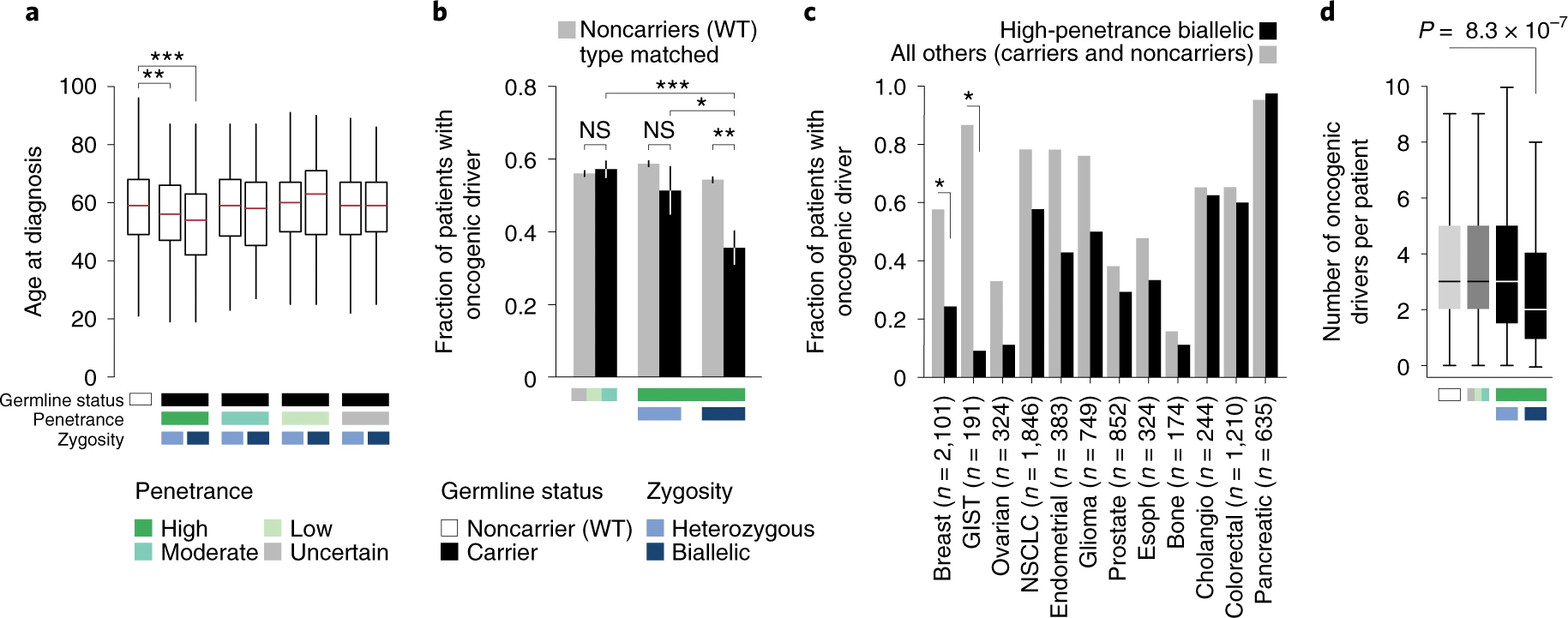 - 前面观察到外显率和肿瘤谱系均与双等位基因失活率相关,作者进一步分析了携带双等位基因失活患者的临床表型,结果表明具有双等位基因失活的携带者发病年龄较低(P = 6 × 10 -14),且携带的体细胞驱动突变数量较少(P = 8.3 × 10-7);