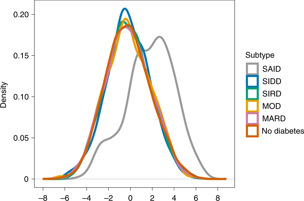 研究意义: 2 型糖尿病 (T2D) 被认为是一种高度异质性的疾病,患者存在不同临床特征、疾病进展、药物反应和并发症风险。T2D可分为五种亚型:自身免疫性糖尿病(SAID,6% 的患者)、胰岛素缺乏型糖尿病(SIDD,18% 的患者)、胰岛素抵抗性糖尿病(SIRD,15% 的患者)、肥胖相关糖尿病(MOD,22% 的患者)、年龄相关糖尿病(MARD,39% 的患者);然而,这些亚型间的病因差异尚不清楚;