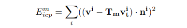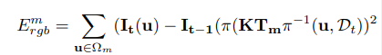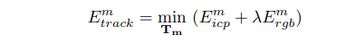 (1)Tracking:跟踪激活模型当前帧下的六自由度位姿,损失函数包括两部分:几何误差(dense ICP)和光度损失(类似直接法)