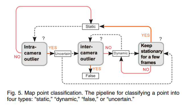- map points的分类:起始所有map points都设置为static,当每一步map结束后将所有map point,然后经过fig.5从左到右依次进行外点判断,将点区分为static、dynamic和false三类。在点分类过程中,动态点的三维位置会随时间自然更新。因此,系统能够生成运动点的三维轨迹。
