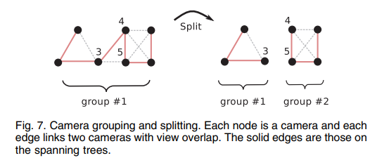 - 分组与分割:因为每一个相机上的每个特征点都是指向对应的map point的,故可以方便的统计相机间重叠的map point数量。依次访问相机,若重叠点数量大于阈值则以两个相机为节点以一条边连接(边的权重是重叠点数量),这样就形成一个无向连通图。此图节点即为一个相机分组,同时对此图提取权值最大的生成树(spanning tree),用以约束intercamera过程中的特征匹配复杂度。