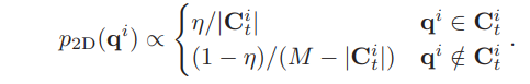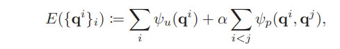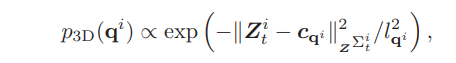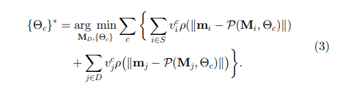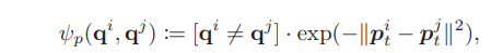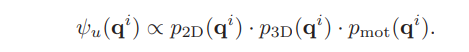 - 一元能量函数表征landmark i属于特定cluster qi的概率,其中p2D包含语义bounding box信息,在bounding box中的点概率大;p3D包含3D空间亲密度,点距离cluster qi的中心 的距离越近概率越大;pmot包含运动信息,将cluster的前几帧运动包含进来计算点的重投影误差: