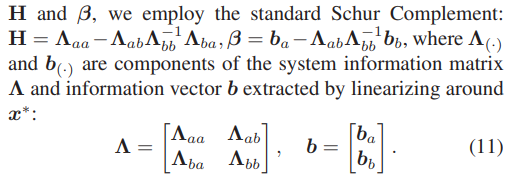 - 对于静态物体(q=0):整个滑动窗口内优化,利用边缘化方法(加入边缘化残差项)
