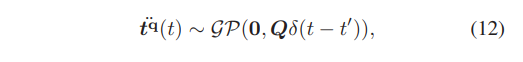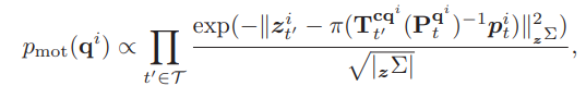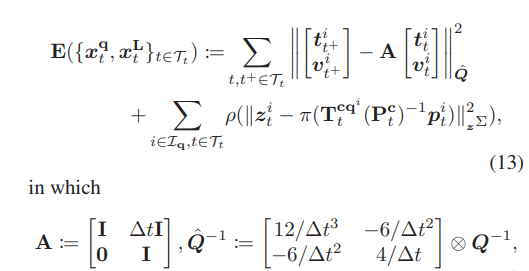 - 对于动态cluster(q!=0):cluster运动模型采用加速度为高斯白噪声的匀速运动,在滑动窗口的时间序列上进行优化,第一个优化项为运动先验,用来平滑运动轨迹,主要由运动模型式(12)得来。