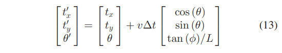 - Object Motion Model:非完整车轮模型(Car motion is represented by linear velocity v and steering angle φ)对于地面上的车辆可以表示为三自由度运动: