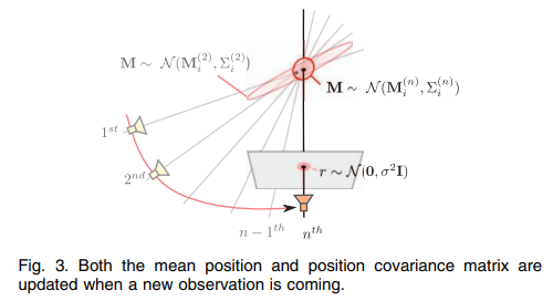 - map points的不确定度:此文只计算map points的三角化不确定度(不像完整的kalmen filter要维护相机状态,各特征点状态相互关系的协方差),其不确定度表示为协方差矩阵,当对于一个map point有新的观测加入时,通过卡尔曼滤增益更新map point pose和其协方差矩阵(注意论文P357相关公式推导),map points不确定度计算可以帮助动态点/静态点区分和