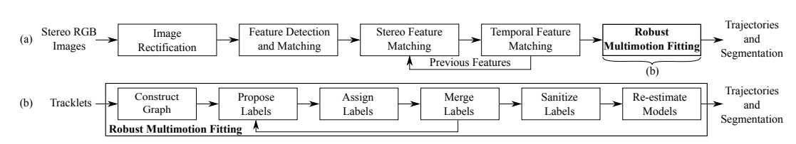 (a)首先提取特征点计算得到3D点并进行帧间track,得到tracklets集合,将tacklets输入Robust Multimotion Fitting模块(多运动引擎)。(b)Robust Multimotion Fitting模块根据轨迹显示的运动(相机和物体运动的组合)对轨迹进行分割。在缺乏关于场景的先验信息的情况下,通过假设这些轨迹属于静态对象,使用每组轨迹来估计相机的运动。这些相机运动假设稍后可以通过识别场景的静态部分(例如,如VO中)转换为相机和对象运动的估计,(b)部分具体操作如下: