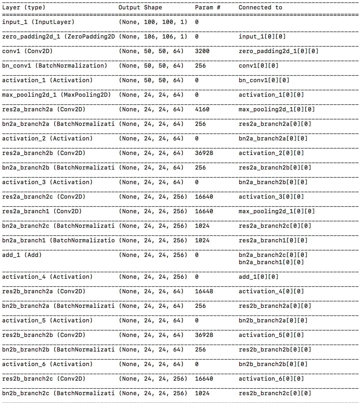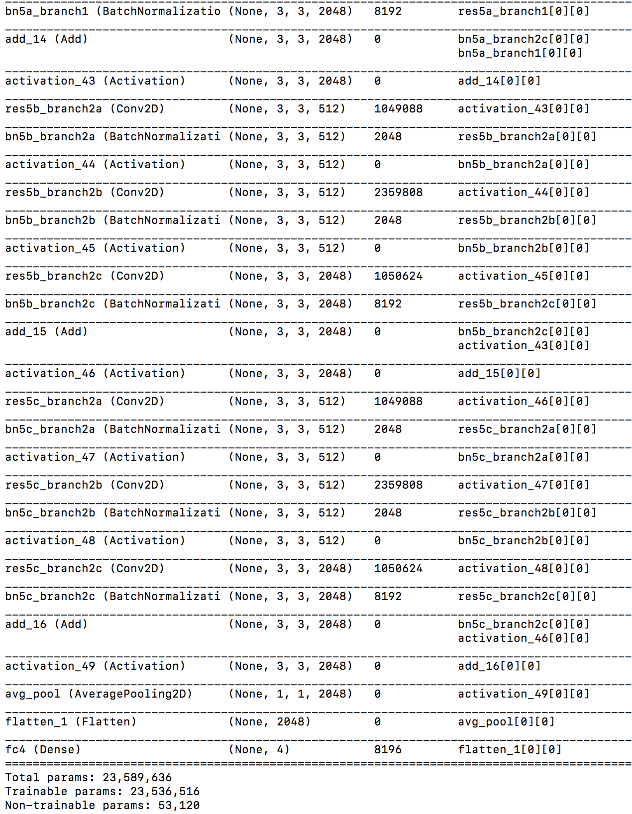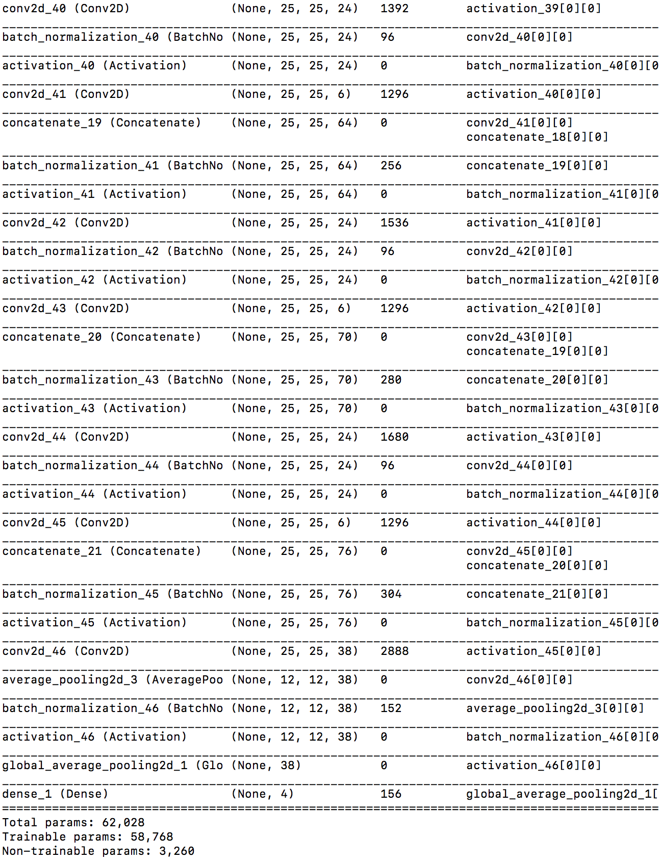 然后我把自己的densenet和resnent的模型打印出来,model.summery()得到了两个模型的结构,下面是densenet的(没截全,只取了一开始和结尾部分):