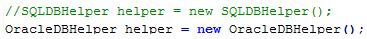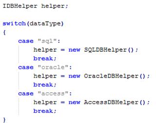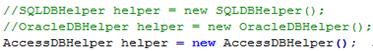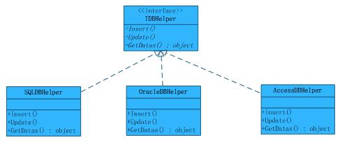 最经典的就是数据操作。创建一个用于SQL server的SQLDBHelper类,又创建了一个用于Oracle的OracleDBHelper类,这两个类所实现的功能是完全一样的,都是增删改查等。如果这两个类是孤立的,那系统数据库切换时候,将导致SQLDBHelper和OracleDBHelper两个类之间的切换,而且改动工作量随着系统复杂度增加。