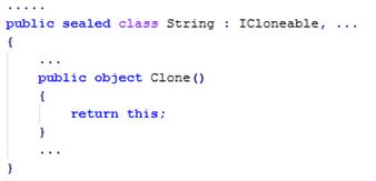 例如FCL中的String类,实现了IColoneable接口,并实现了接口方法Colone()。