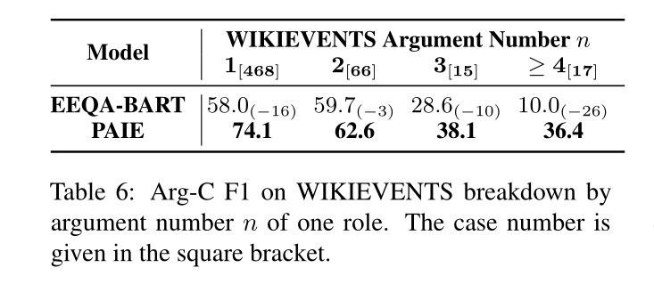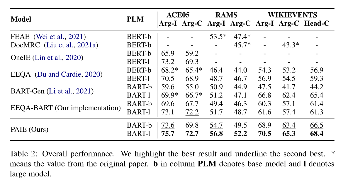 表2将我们的方法与所有基线进行了比较。我们观察到PAIE在所有数据集上表现最好。对于S-EAE,我们的基本模型在ACE05上实现了绝对的Arg-C提高2.1%。对于DEAE,我们的基础模型在RAMS和WIKIEVENTS上分别获得2.1%和6.3%的ArgC增益。同样,我们的大版本模型实现了3.5%和2.9%的收益。这表明我们提出的方法在处理不同长度的上下文时具有良好的泛化能力。