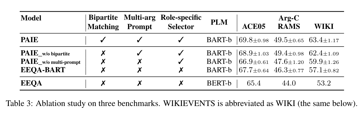 - 我们在三个基准上进行了广泛的实验。结果表明,使用PAIE有很好的改善效果(基本模型和大模型的F1平均增益分别为3.5%和2.3%)。进一步的消融研究证明了我们提出的模型的效率和泛化到少样本设置,以及提示调整抽取的有效性。