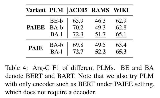 PAIE分别将上下文输入BART-Encoder和提示符输入BART-Decoder。一个看似合理且简单的变体叫做PAIEE (PAIE-Encoder),将上下文和提示连接起来,然后将它们直接送入编码器。在本节中,我们调查了PAIEE与PAIE的表现,如表4所示。