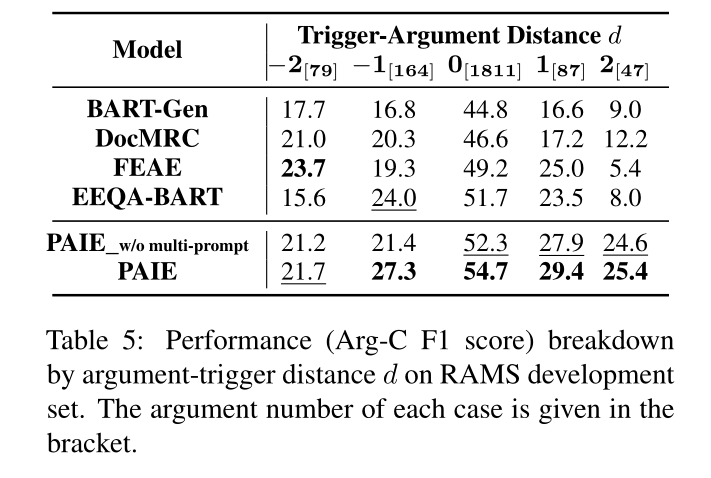 在文档级事件抽取中,论元分布在多个不同的句子中,因此需要进行长距离捕获抡元之间的依赖。我们可以看到(1)PAIE显著提高了抽取长距离论元的能力,特别是对于触发词后面的论元(见 d d d值为正的列)。(2)从表的最后两行可以看出,PAIE中的联合提示充分利用了角色之间的隐式交互,角色之间的相互制约降低了有效抽取远距离论元的难度。