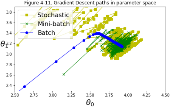 Batch Gradient Descent is the fact that it uses the whole training set to compute the gradients at every step, which makes it very slow when the training set is large. At the opposite extreme, Stochastic Gradient Descent just picks a random instance in the training set at every step and computes the gradients based only on that single instance. Obviously this makes the algorithm much faster since it has very little data to manipulate at every iteration. It also makes it possible to train on huge training sets, since only one instance needs to be in memory at each iteration (SGD can be implemented as an out-of-core algorithm.)