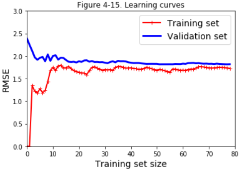 First, let’s look at the performance on the training data: when there are just one or two instances in the training set, the model can fit them perfectly, which is why the curve starts at zero. But as new instances are added to the training set, it becomes impossible for the model to fit the training data perfectly, both because the data is noisy and because it is not linear at all. So the error on the training data goes up until it reaches a plateau(高原; 平稳时期,稳定水平; 停滞期), at which point adding new instances to the training set doesn’t make the average error much better or worse.