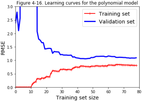 Now let’s look at the learning curves of a 10th-degree polynomial model on the same data (Figure 4-16):from sklearn.pipeline import Pipelinepolynomial_regression = Pipeline((("poly_features", PolynomialFeatures(degree=10, include_bias=False)),("lin_reg", LinearRegression()), ))plot_learning_cures(polynomial_regression, X,y) plt.axis([0,80,0,3]) plt.title("Figure 4-16. Learning curves for the polynomial model") plt.show()